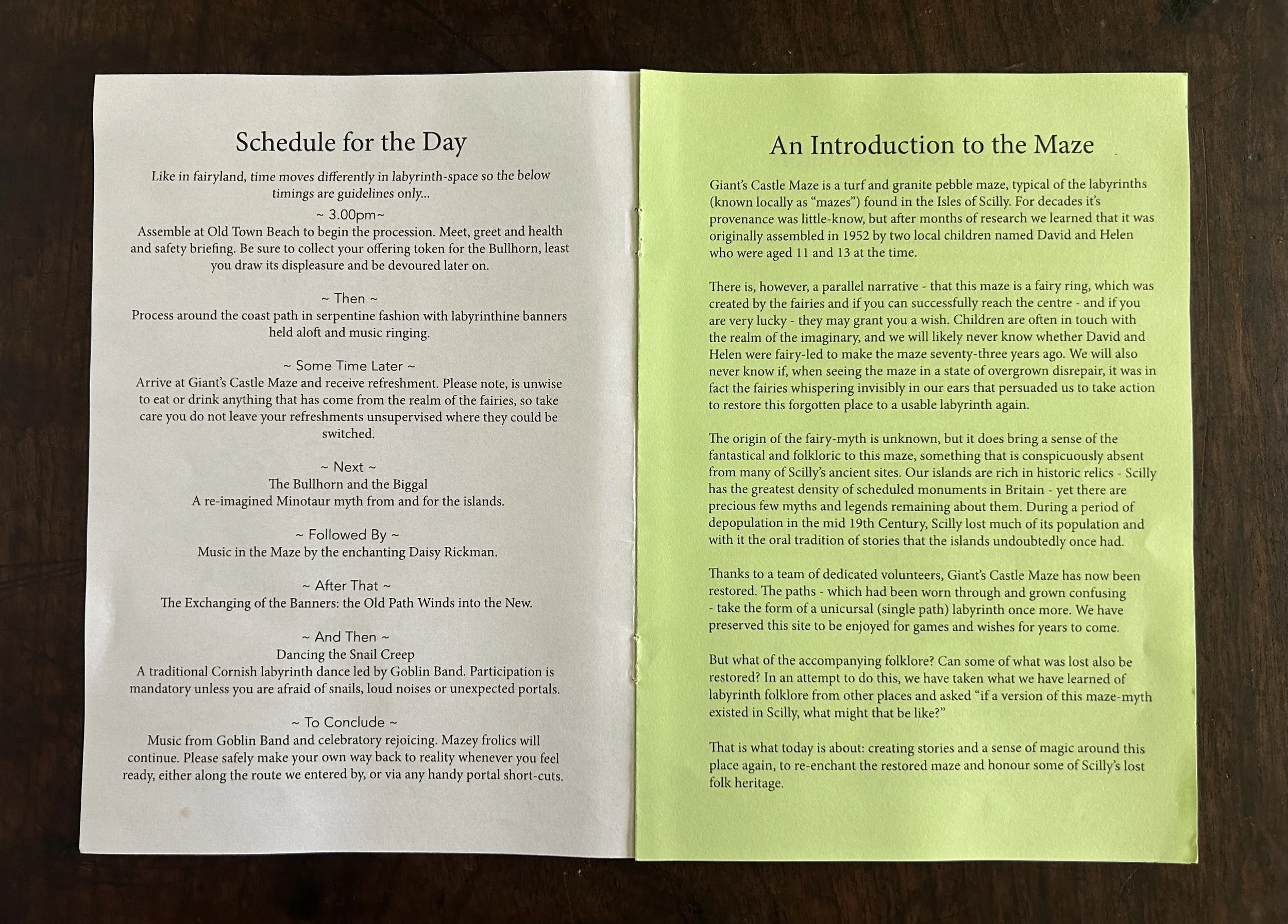 We used the opportunity of “reopening” the restored labyrinth to reimagine some of Scilly’s lost folklore and traditions. Taking clues from nearby traditions, Cornish language, Scillonian place names, and labyrinth myths from other cultures, we created a high summer Labyrinth Festival that playfully explored Scilly’s lost folk heritage and celebrated the tradition of maze-making on the islands.