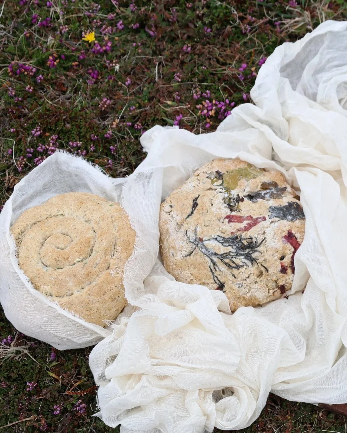 Fig leaf wine and snail-shaped soda bread wrapped in muslin cloth on a bed of heather.