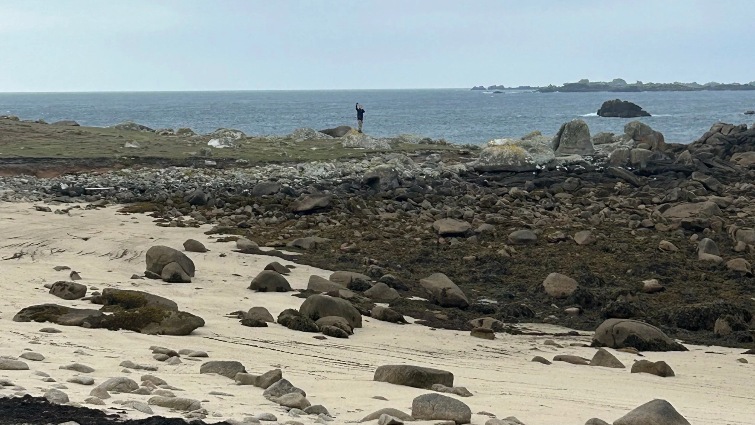 Tom and his wife Tehmina Goskar (who is a Research Fellow at University of the Arts London, a Research Curator at the Museum of Cornish Life in Helston, and a specialist on precious stone and minerals - more on that in another blog post!) - arrived on Scilly on windy drizzly morning. After warming up over coffees at the airport cafe, we began our expedition out to Giant’s Castle. Tom began by walking the labyrinth and taking in the surrounding area, in order to get a better understanding of the site. He then produced one of many cameras and began by taking a gaussian splat render of the site, before moving on to lidar and photogrammetry techniques.