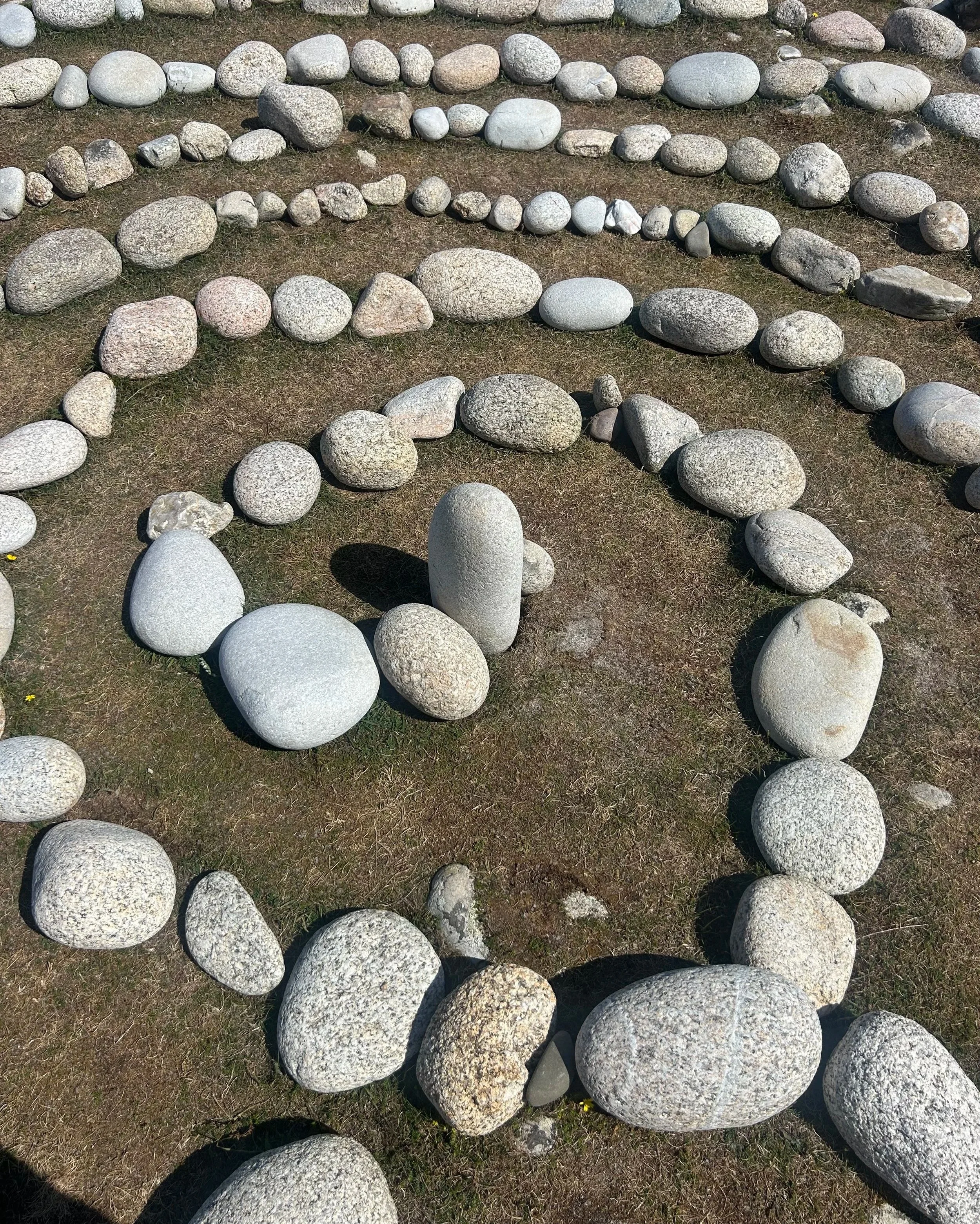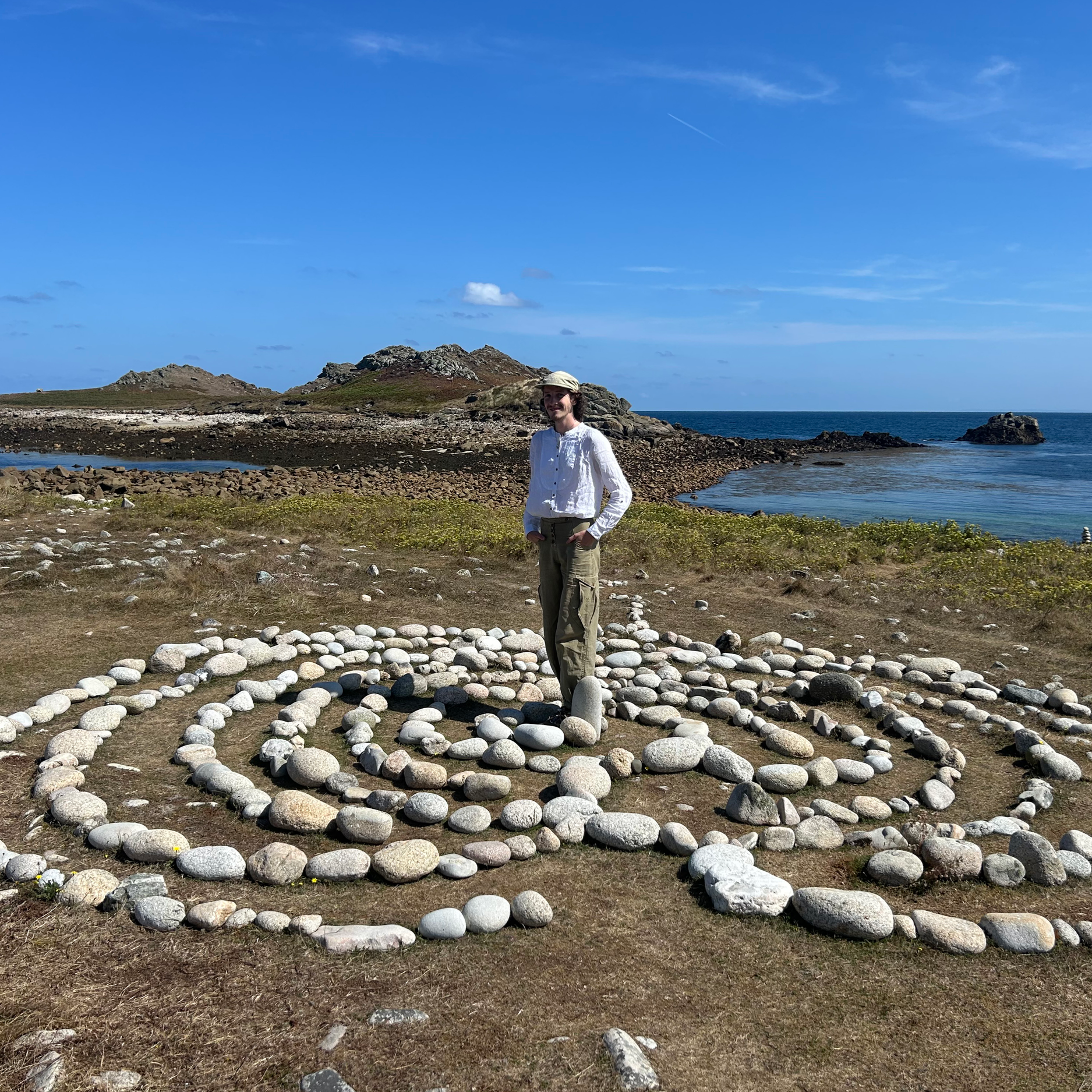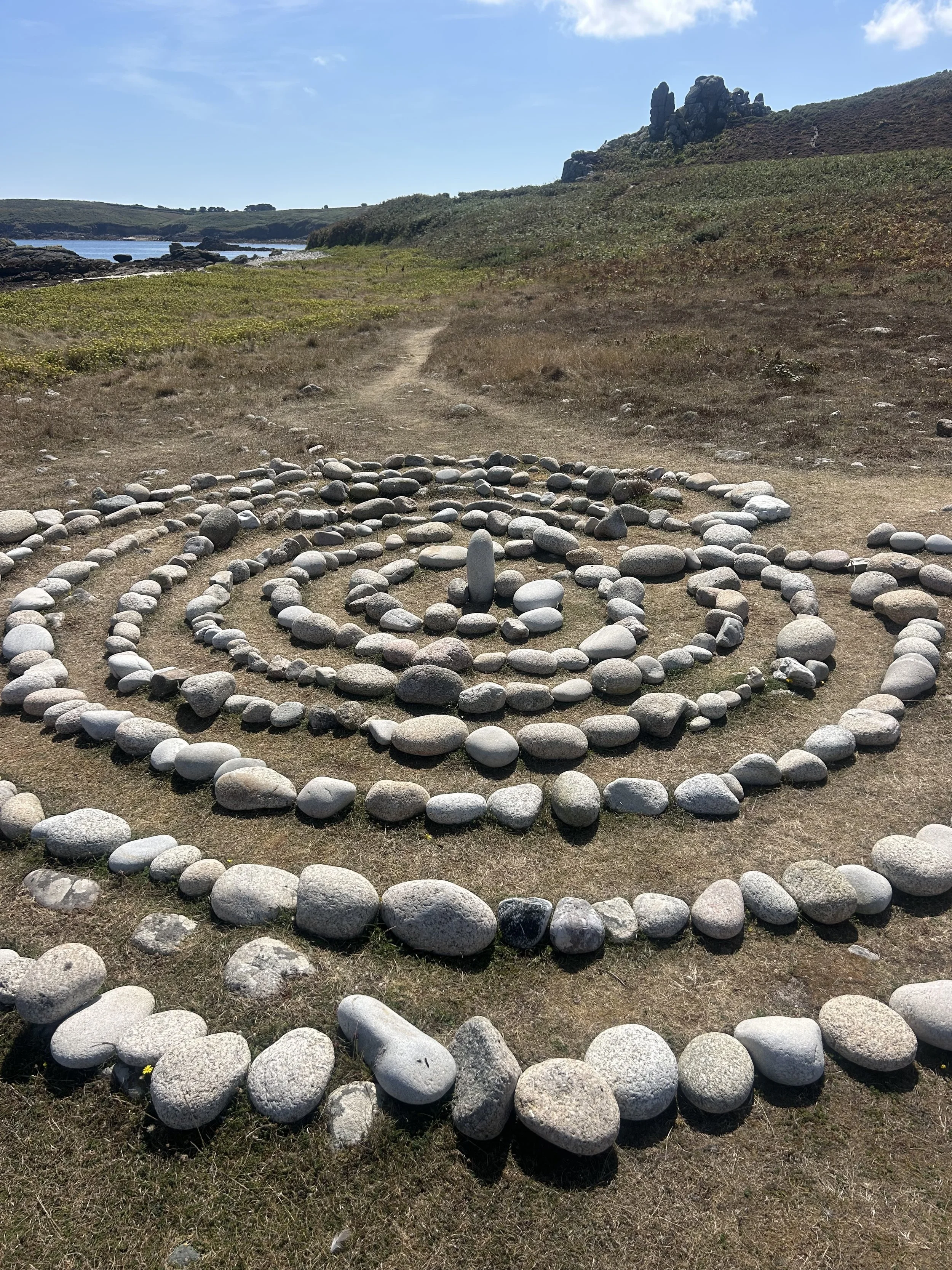However, when we arrived at White Island Bar - site of pebble-maze-making on St Martin’s since circa WW2 - we found that someone else had already mended the maze, turning it into a single path (unicursal) labyrinth again. This made us so incredibly happy! We knew that the maze would only survive if people on the islands wanted it there, otherwise it would slowly fade and vanish back into the landscape (which is also fine). But to see that someone else had liked it enough and cared enough to mend it, reassured us that people do want it here, and the mazes are special and meaningful for a lot of people.