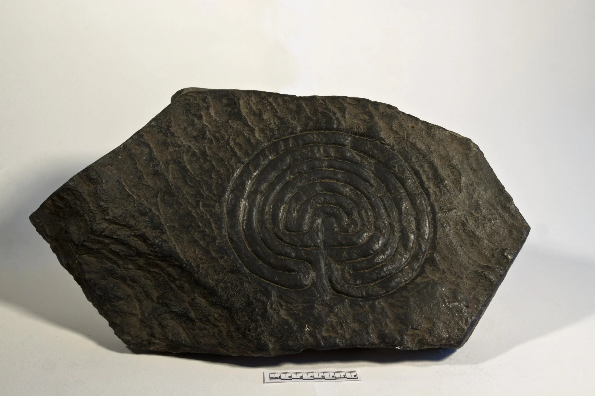After we graduated at the beginning of the summer of 2023, we took a trip together, visiting my family in Devon, then renting a car and camping around Cornwall, before taking the ferry across to Scilly. We slowly made our way further West, drawn along the St. Michael line (an energetic pathway slicing sword-like across the South of England, connecting auspicious sites such as Avebury ring and Glastonbury Tor with others in Cornwall and Scilly, if you believe such things). We visited many ancient sites along the way, but especially important to this project was a visit to the Museum of Witchcraft and Magic in Boscastle. Upstairs in the museum is a small, unassuming stone, apparently once built into the wall of a Cornish farm. It is carved with a small classical labyrinth design. It had a strong, quiet presence to it, and I surreptitously traced my finger along its lines. The label said that it is possibly based on two similar petroglyphs in Rocky Valley. Looking it up on my phone, we realised it was only a short drive away, so upon leaving the museum we sought them out.