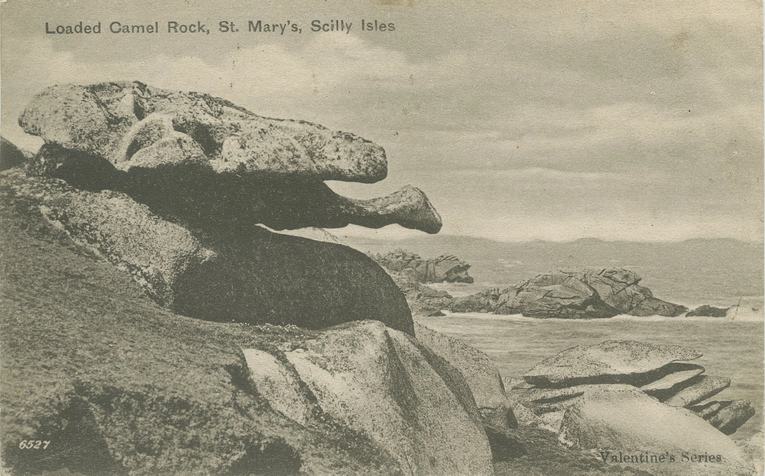 An early, hand-tinted postcard showing the Loaded Camel rock, from the SA&H museum archive on St Mary’s.